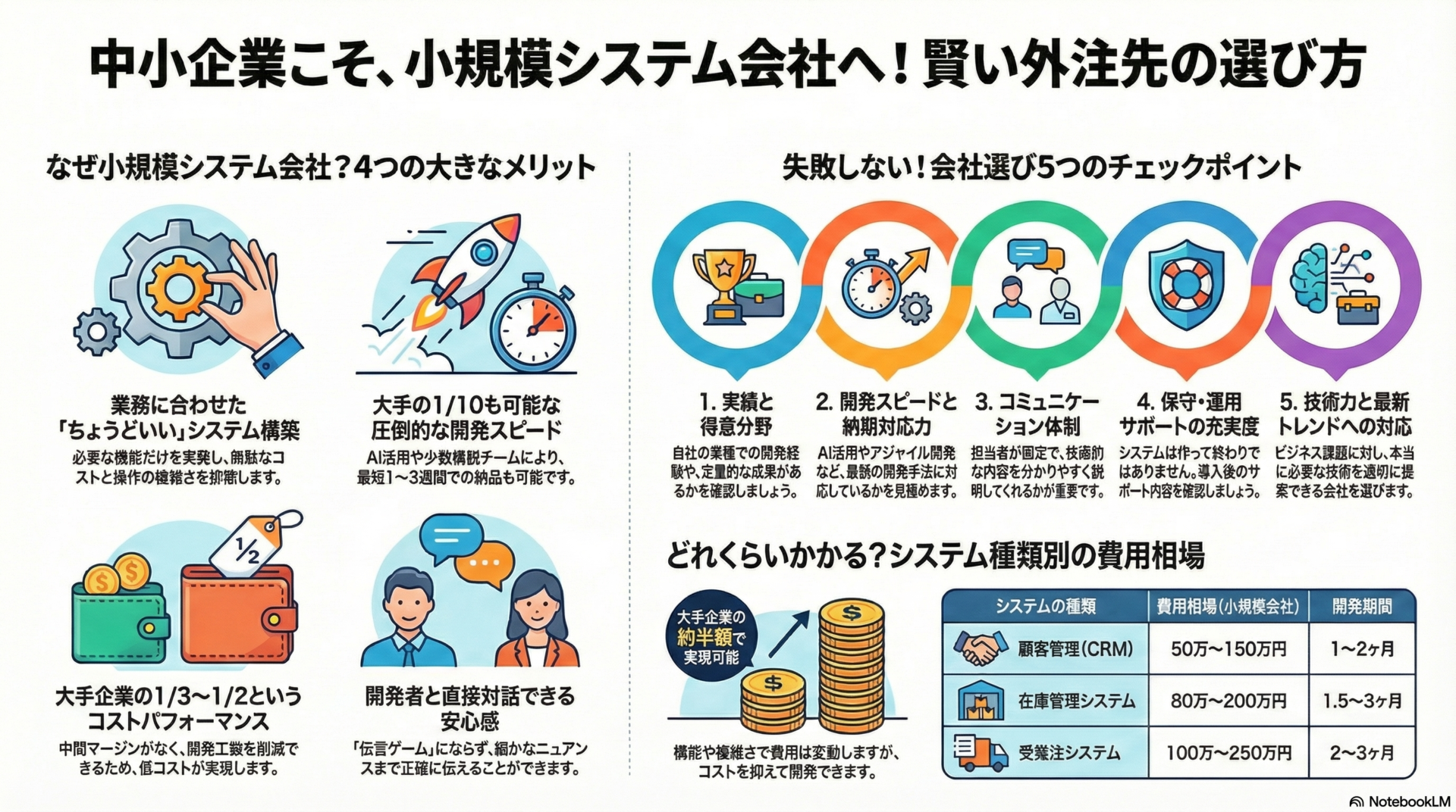 小規模システム会社のメリットを理解したところで、次に重要なのが「どの会社を選ぶか」です。以下の5つのポイントを押さえることで、失敗のリスクを大幅に減らせます。