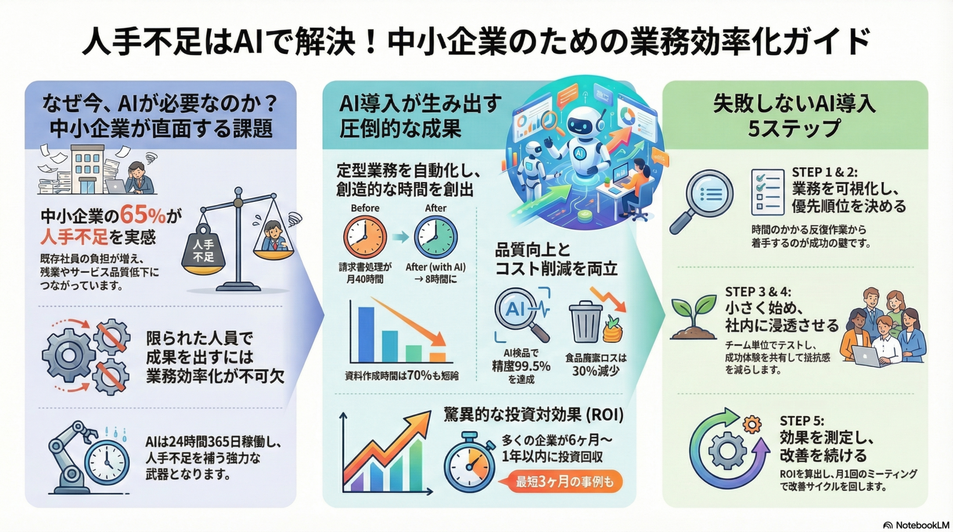 「人手が足りない」「残業が減らない」——こうした悩みを抱える中小企業にとって、AI業務効率化は今や必須の経営戦略です。本記事では、中小企業がAIを導入して業務効率を30%以上向上させる具体的な方法を、実際の成功事例とともに解説します。