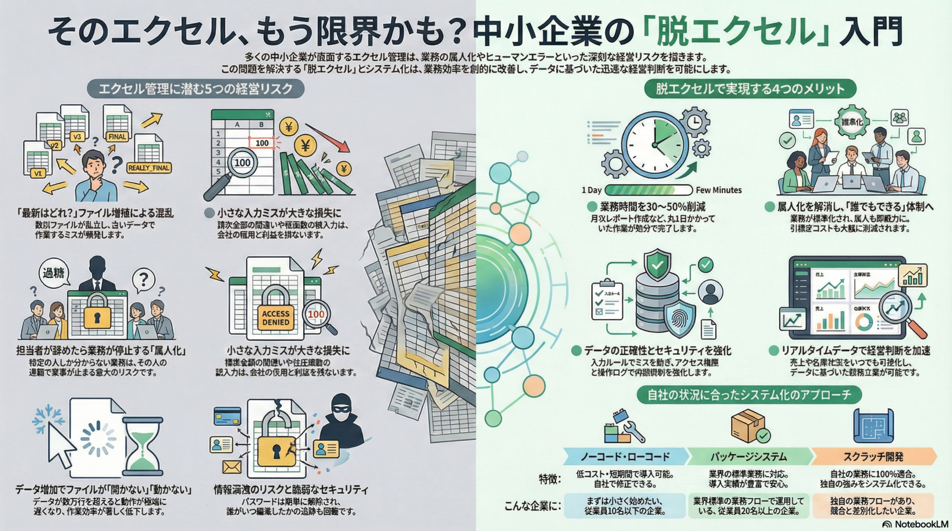 「Excelファイルが重くて開けない」「どれが最新版かわからない」「担当者が休むと業務が止まる」――エクセル管理の限界を感じていませんか?