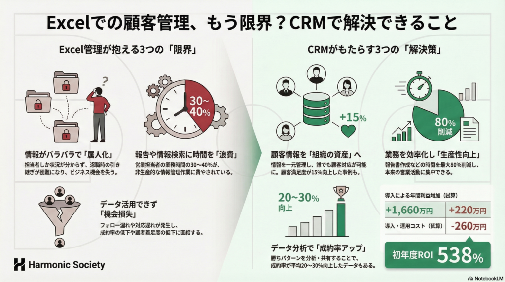 Excel管理の限界を感じている企業にとって、CRMシステムの導入は単なる業務効率化ツールではありません。顧客との関係性を資産化し、組織の持続可能な成長を実現するための戦略的投資です。