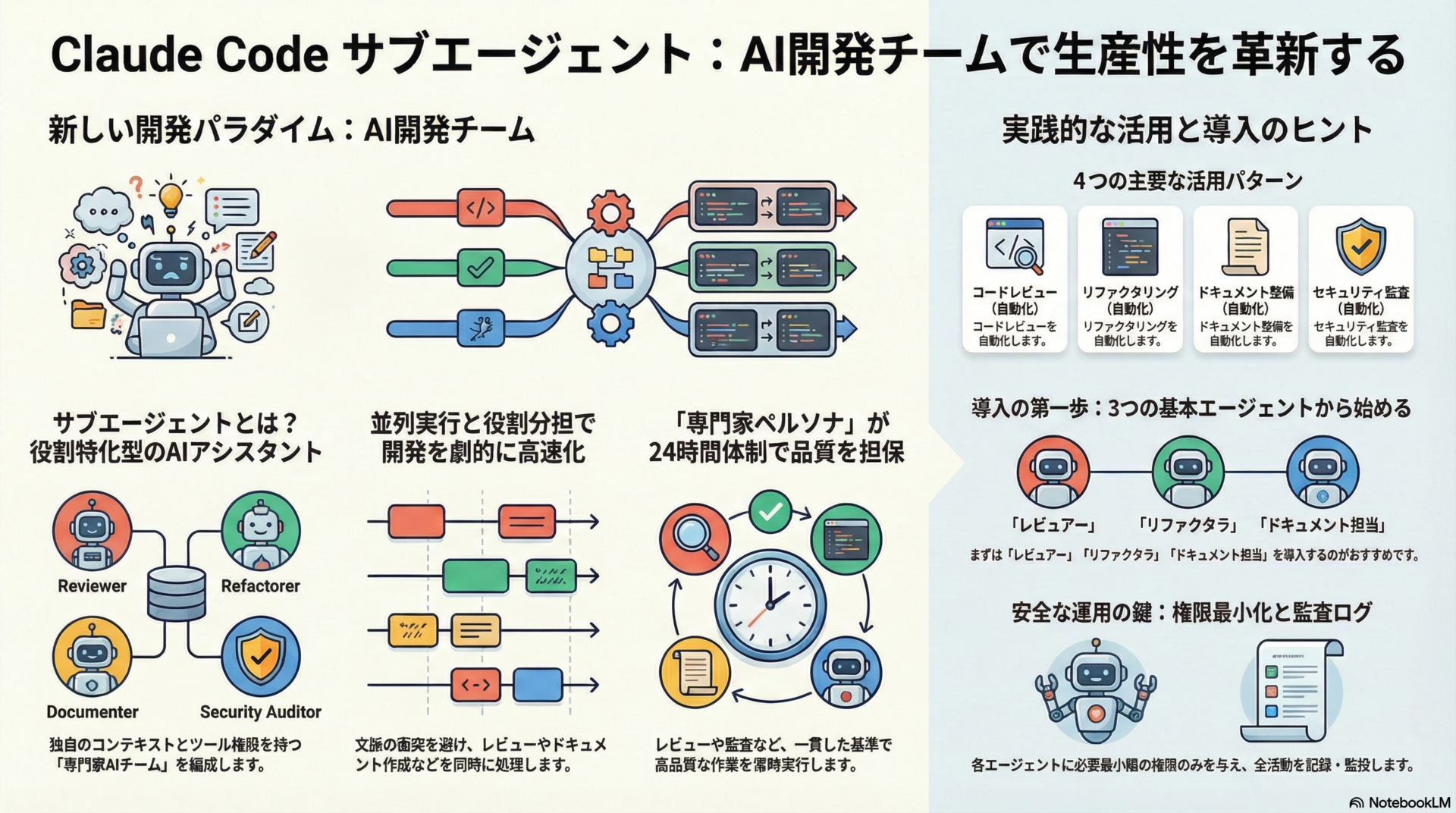 本記事では、Claude Codeサブエージェントの基本概念から実装方法、活用パターン、そして運用のベストプラクティスまで、実践的な知識を体系的に解説します。これを読めば、あなたも今日からAIチームを編成し、開発プロセスを革新できるようになります。
