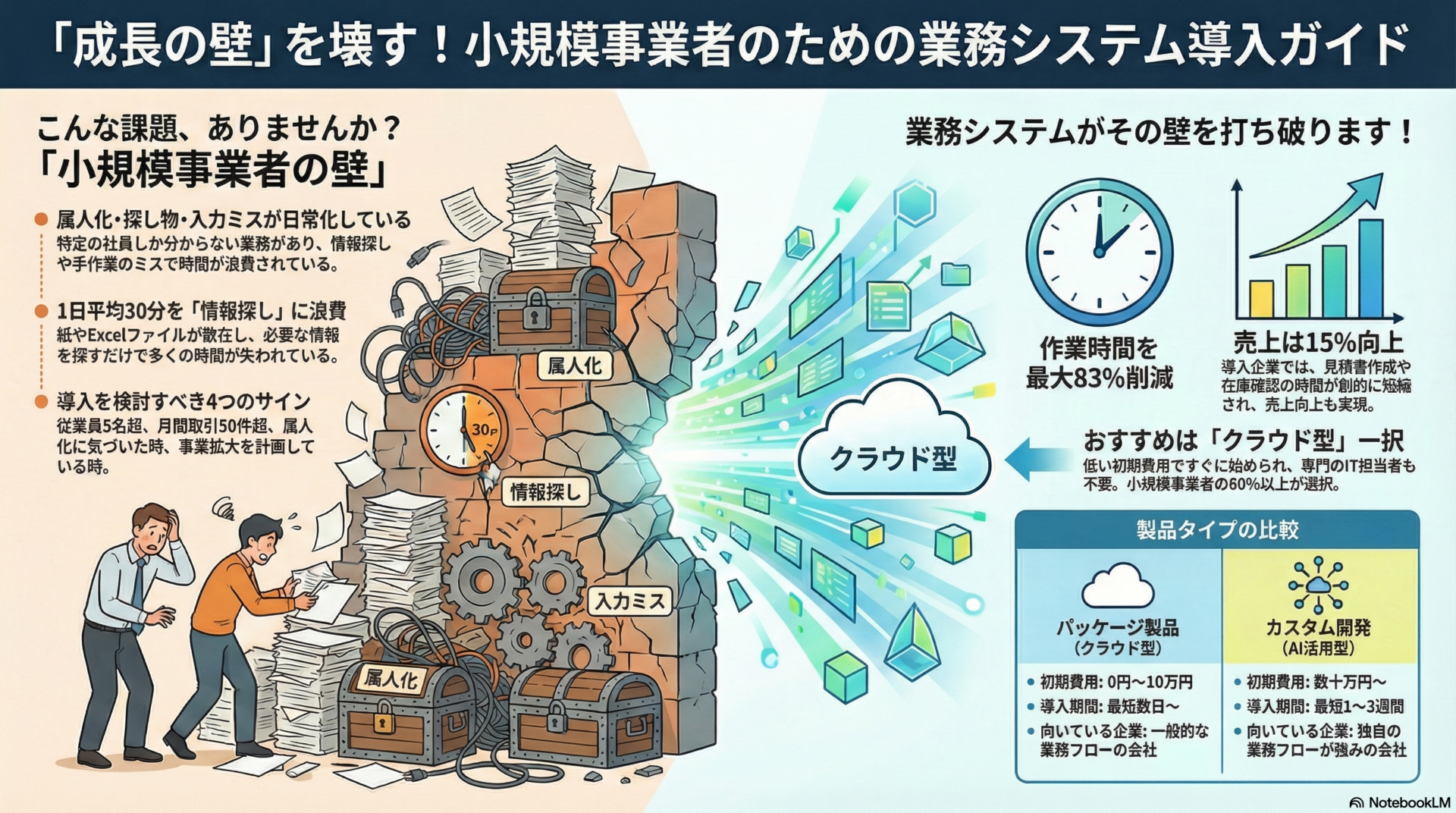 小規模事業者が抱える典型的な課題は、業務システムの導入によって大きく改善できます。