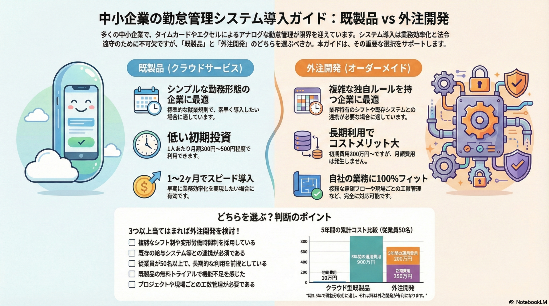 - 5年間コスト:クラウド型300万円以上、外注開発400万円〜500万円