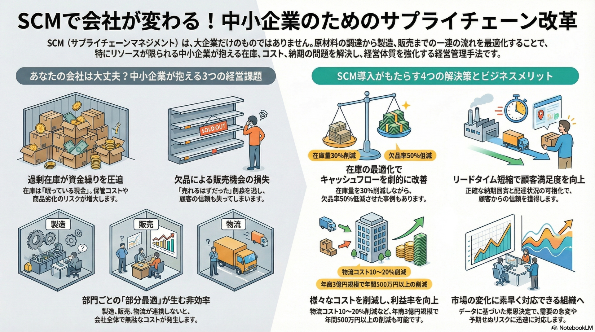 「SCMは大企業のもの」という認識は誤解です。むしろ中小企業こそSCMの効果が大きいと言えます。