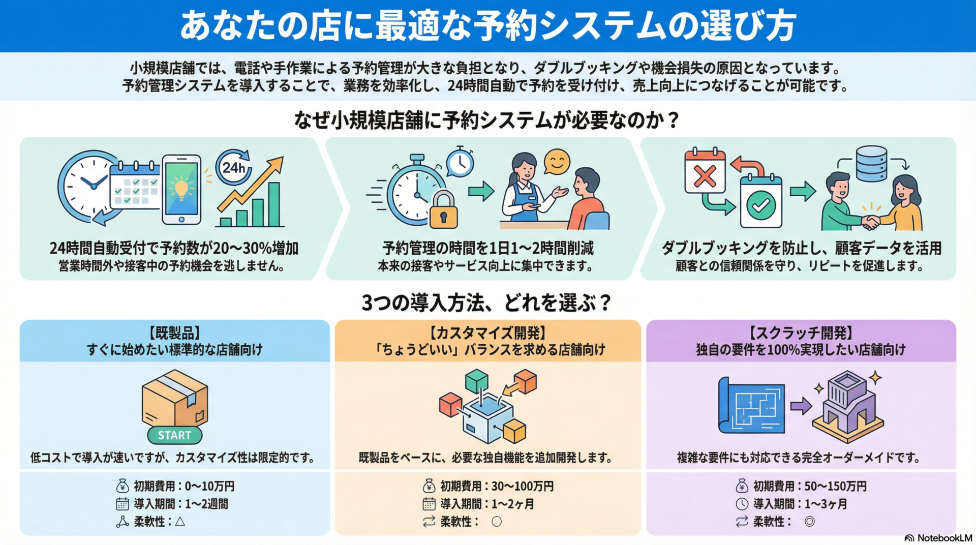 小規模店舗(1〜2店舗)で標準的な予約業務のみなら既製品、中規模店舗(3〜10店舗)で一部独自要件があるならカスタマイズ、複数店舗展開や特殊な業務フローがあるならスクラッチ開発が適しています。